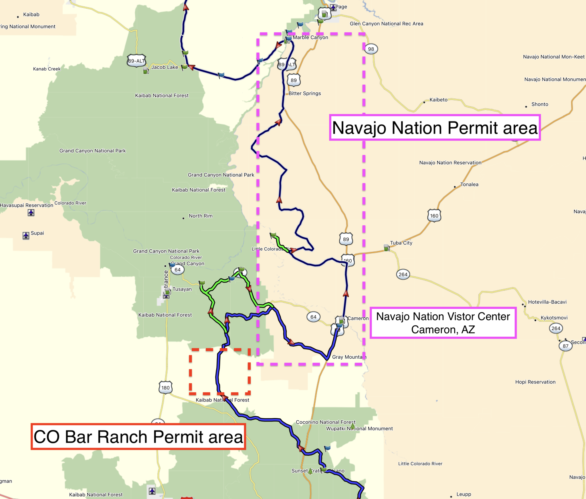 3: The third permit is required when riding through Navajo Nation (Sections 5 & 6) and is required to ride and camp in Navajo Nation. Camping and riding permits are $15 each per person (cash only). They can be purchased at the small round building (visitor center) at the junction of Hwy 64 and 89 in Cameron. Don’t plan on entering these lands after dark after the permit office is closed.