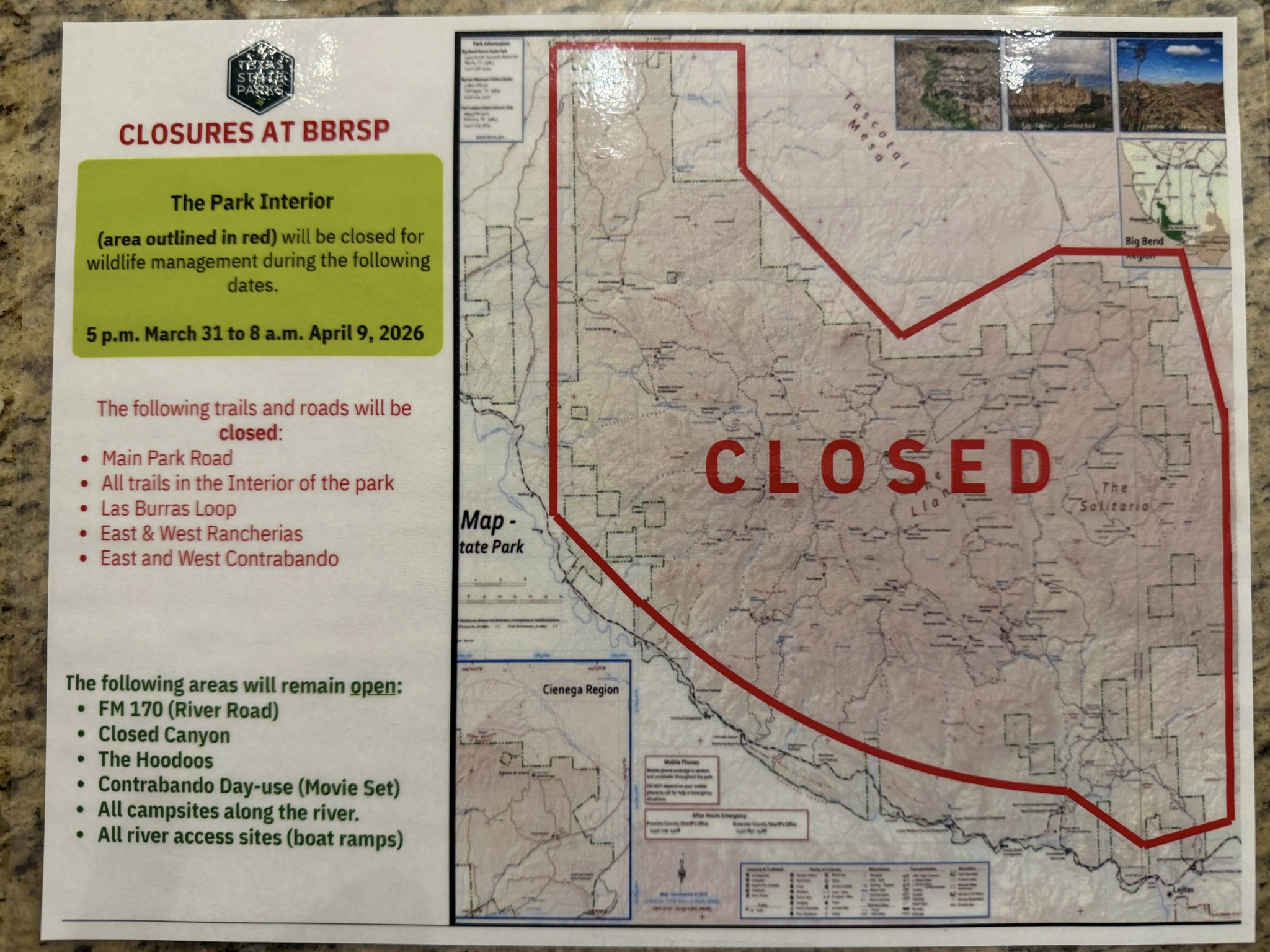 This closure will limit lodging opportunities in the area. Riders wishing to lodge or camp at Chisos may need to detour to Terlingua/Study Butte for motels or camp at Rio Grande starting Fall 2025.