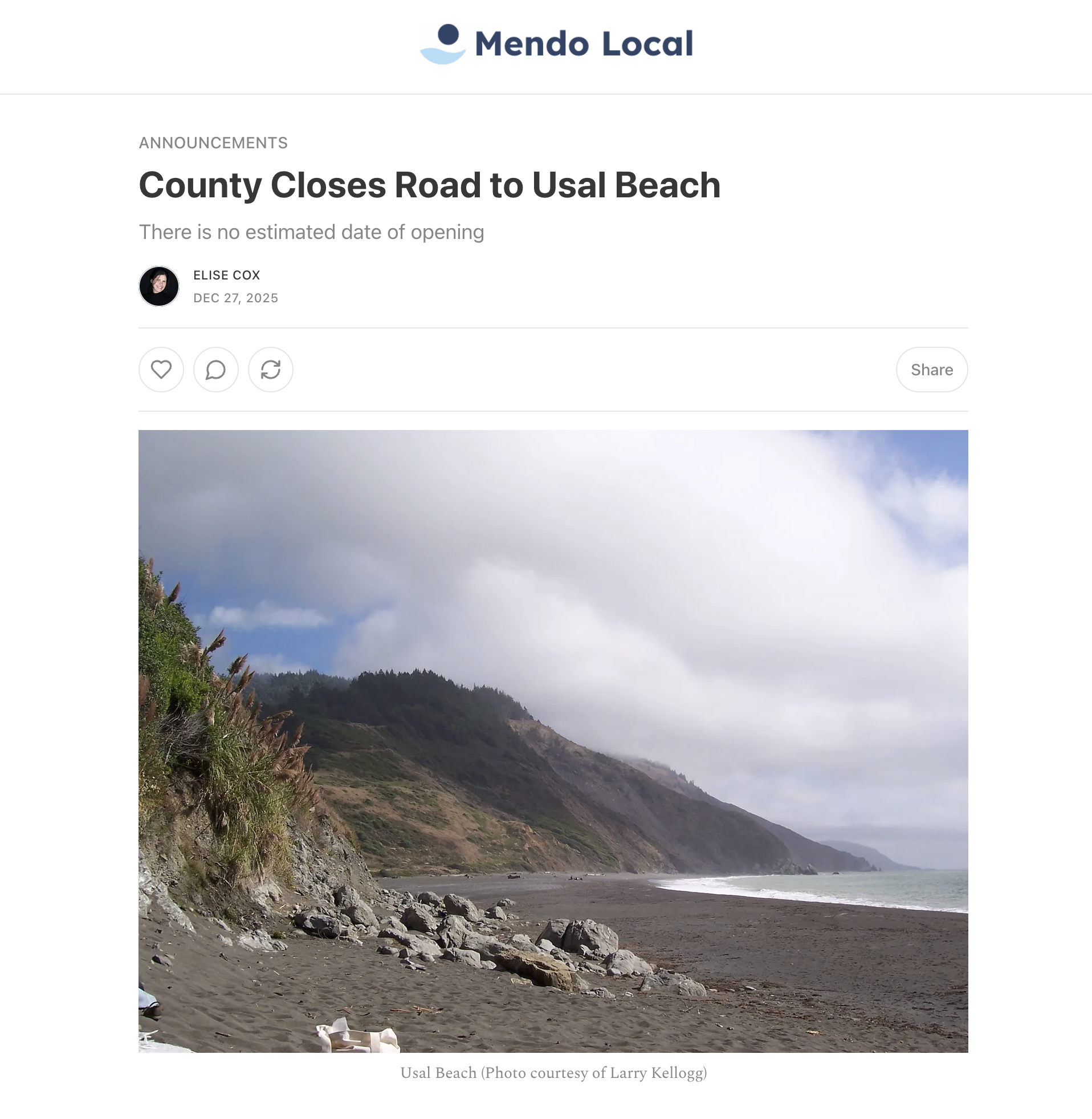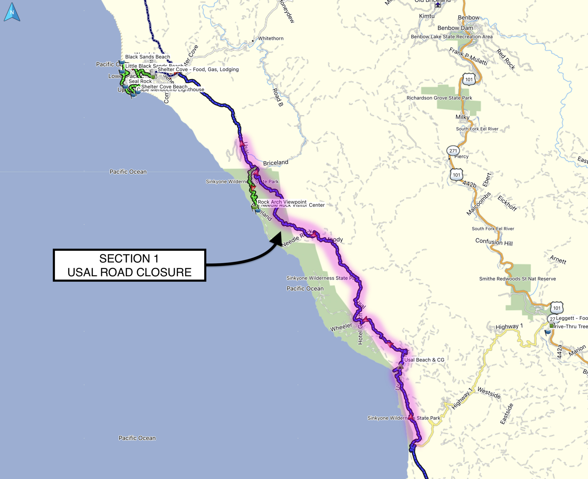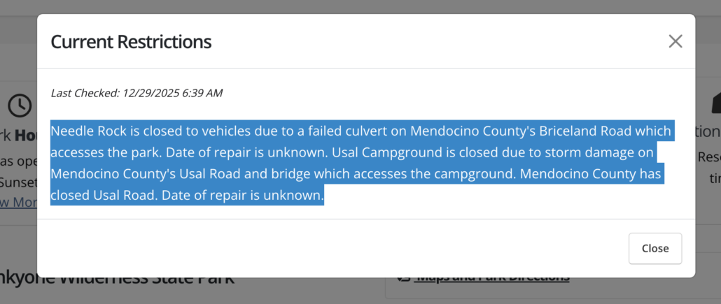 Mendocino County has added a new closure alert for Usal Road due to culvert repairs and storm damage. This also affects access to the Sinkyone Wilderness Needle Rock State Park.