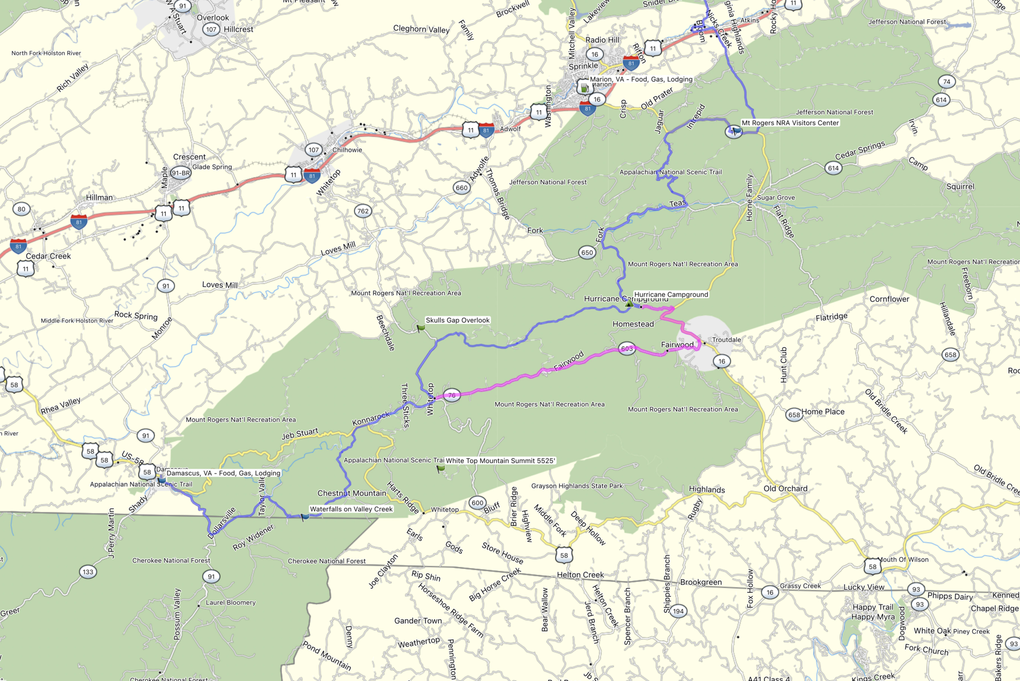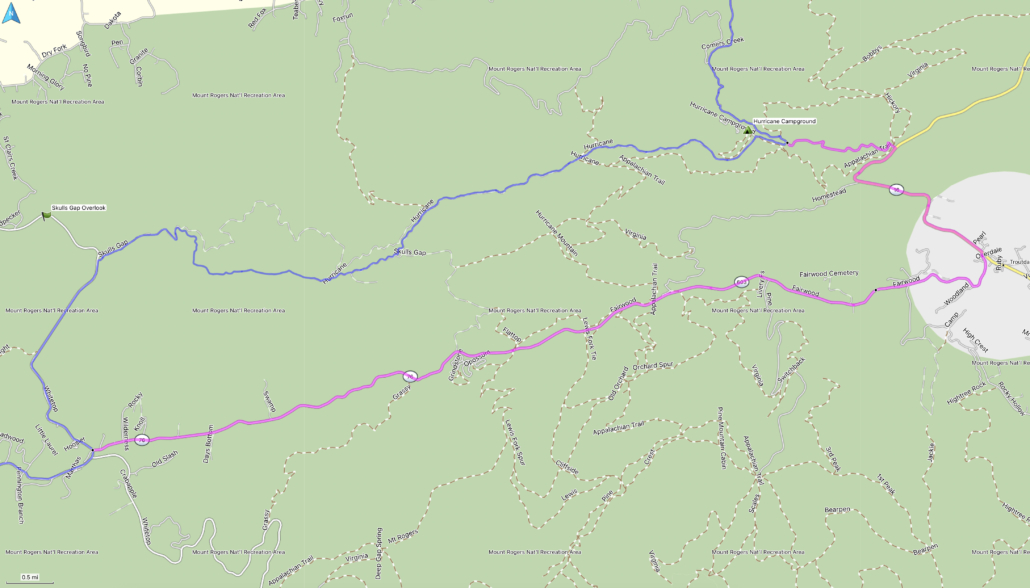 Heading north: Once you cross Big Laurel Creek going north on SR 600 from Konnarock, make the right on to SR 603 Laurel Valley/Fairwood Valley Rd (going to Troutdale), until the stop sign at VA Hwy 16. Turn left (going towards Marion) and follow that until the sign the sign for Hurricane Campground. There you can turn left on to SR 650 and that will take you to where you can continue on the designated route.