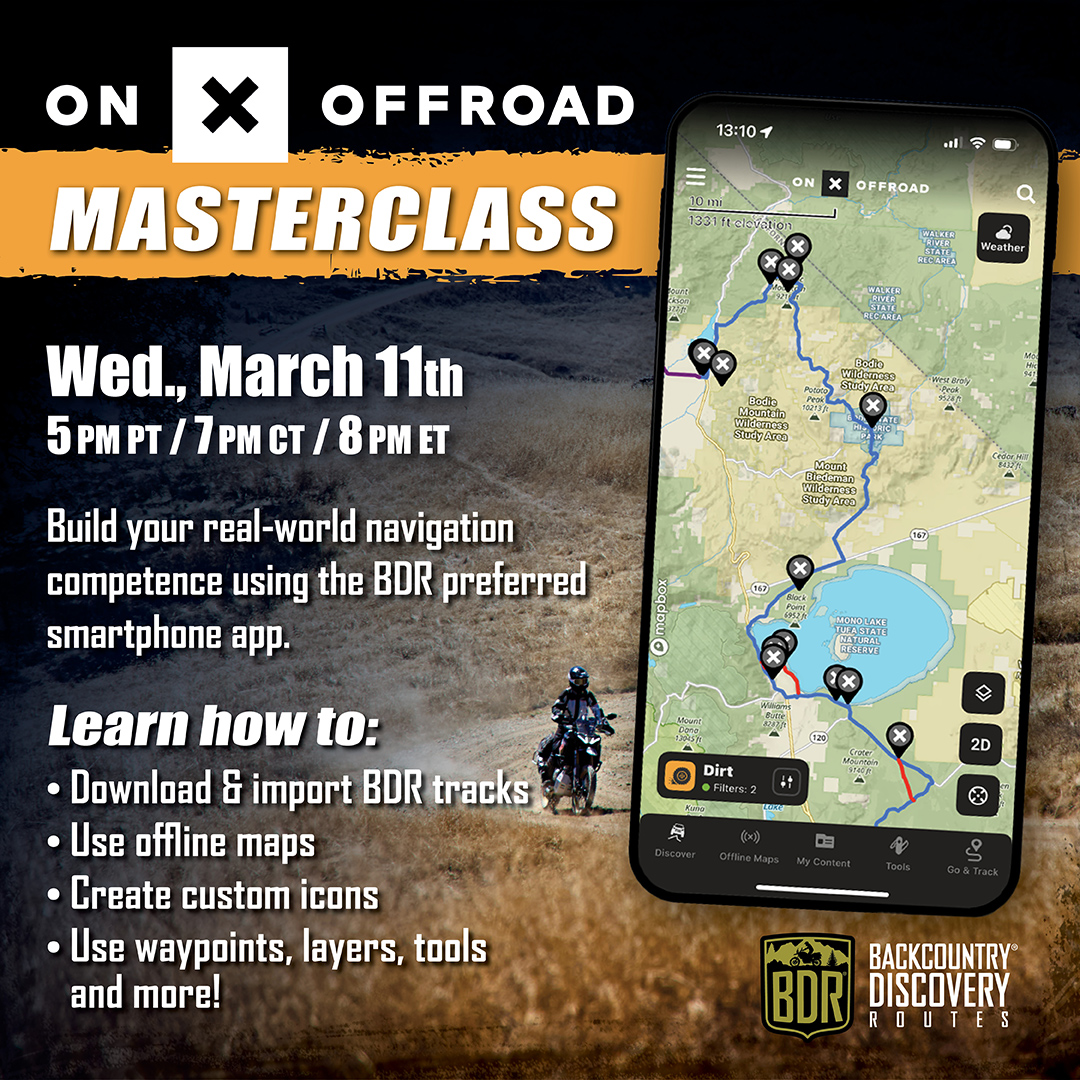 This session is focused on building real-world navigation competence on your phone and helping riders use onX as a key planning and execution tool for BDR travel.