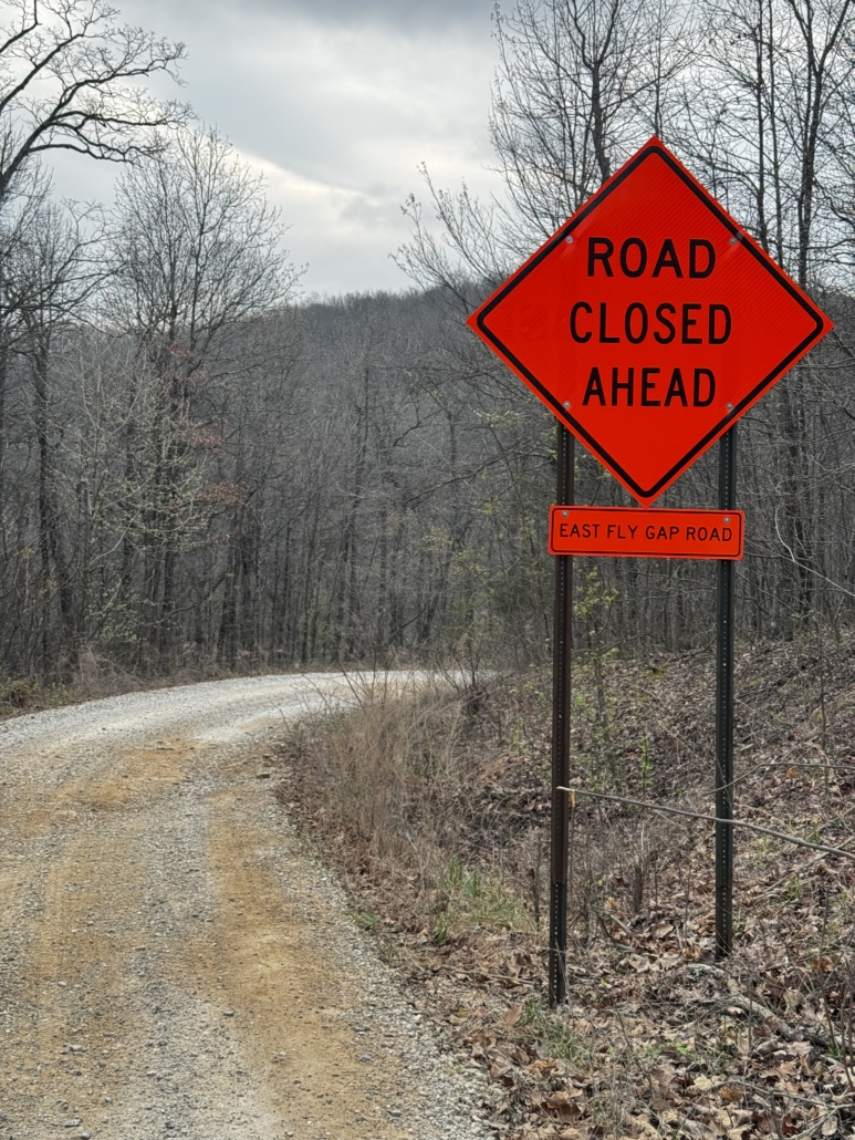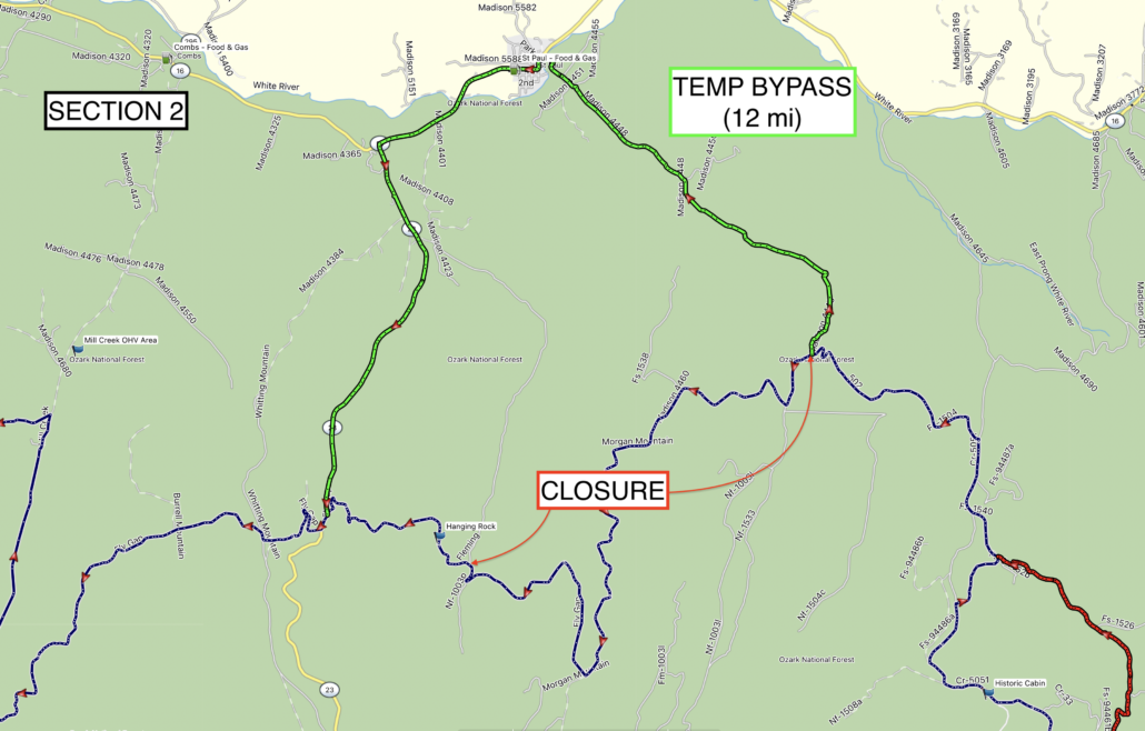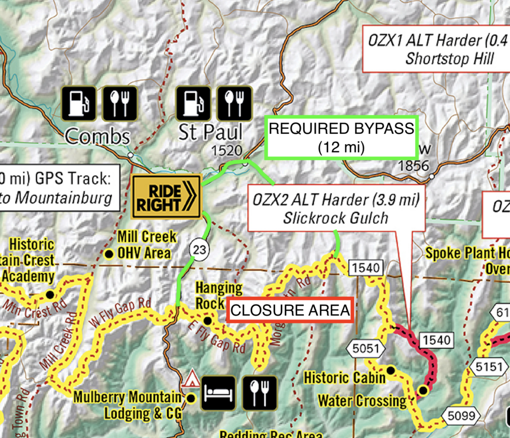 - A 12 mi required bypass is in place for a Forest Service gated road closure on Morgan Mtn/East Fly Gap Road. A temporary bypass track is included in the .gpx file. Fuel and food are available in St Paul.