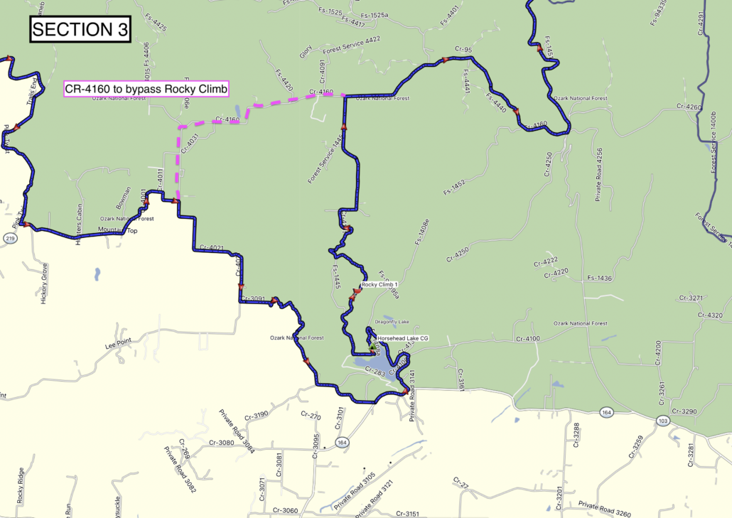 - Near the waypoint for ‘Rocky Climb 1’ just north of Horsehead Lake, the road has deteriorated and is rockier than usual with some small steps and ledges. Riders wishing to bypass can take CR-4160.